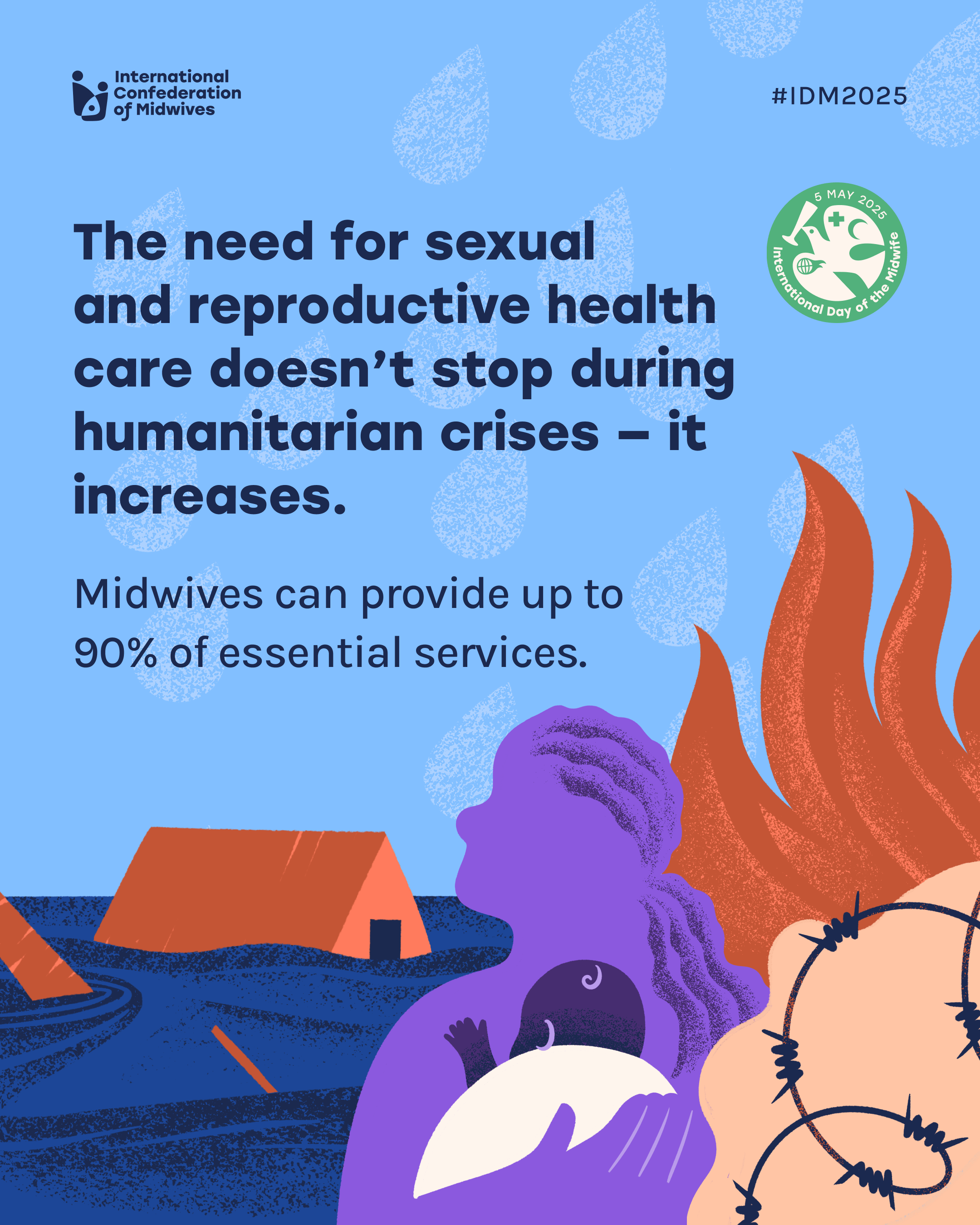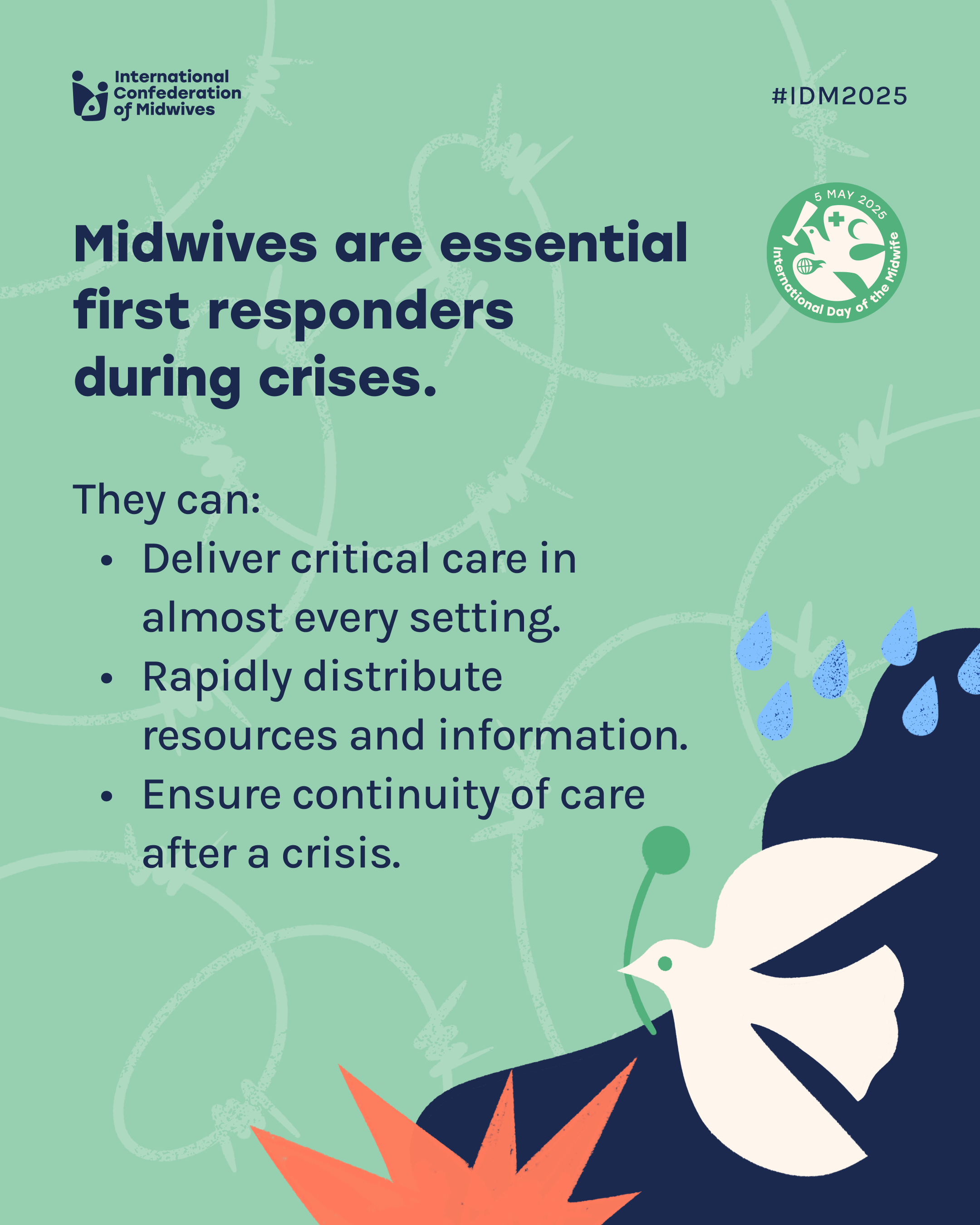 Como matronas y matrones, desempeñamos un papel fundamental en la respuesta a las crisis y en la preparación de los sistemas de salud para proteger la salud y los derechos de nuestras comunidades, incluso en las situaciones más difíciles. Trabajamos en las comunidades en las que vivimos y gozamos de la confianza de aquellos a quienes servimos. Cuando estalla una crisis, somos de los primeros en responder, brindando asistencia vital con recursos mínimos, distribuyendo suministros esenciales y garantizando la continuidad de la atención en caso de complicaciones inducidas por la crisis, como la violencia sexual, la pérdida del embarazo y las infecciones de transmisión sexual.