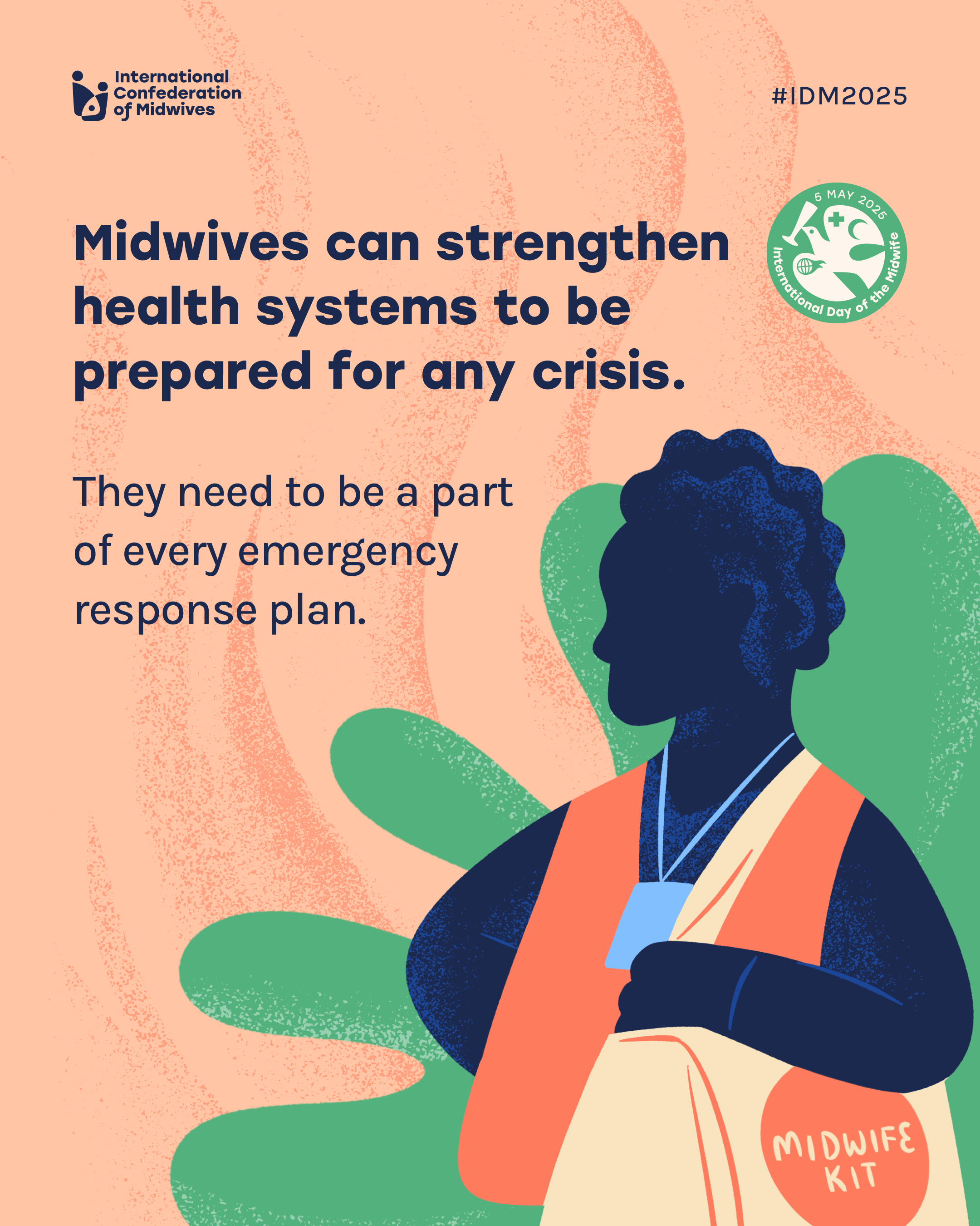 En la Confederación Internacional de Matronas (ICM) reconocemos lo que las matronas y matrones representan en estos tiempos difíciles. Ellos son agentes de respuesta inmediata de confianza dentro de sus comunidades que pueden fortalecer los sistemas de salud para que sean resilientes ante las crisis. Pueden prestar hasta 90% de los servicios de salud sexual, reproductiva, materna, neonatal, infantil y adolescente (SSRMNIA), incluso durante crisis humanitarias más complejas. Por esta razón, el lema para la celebración del Día Internacional de la Matrona (DIM) de este año es .